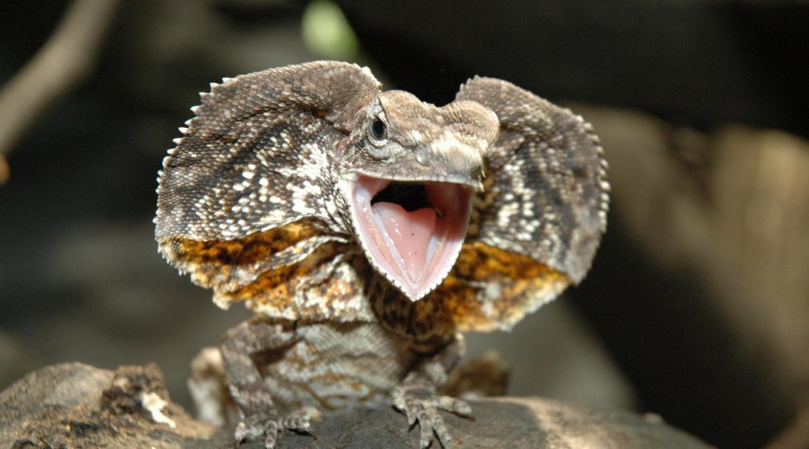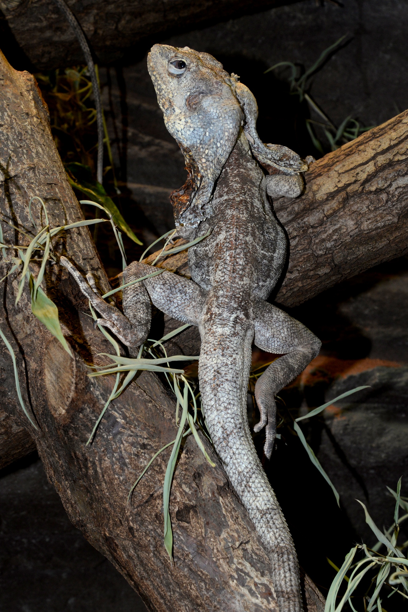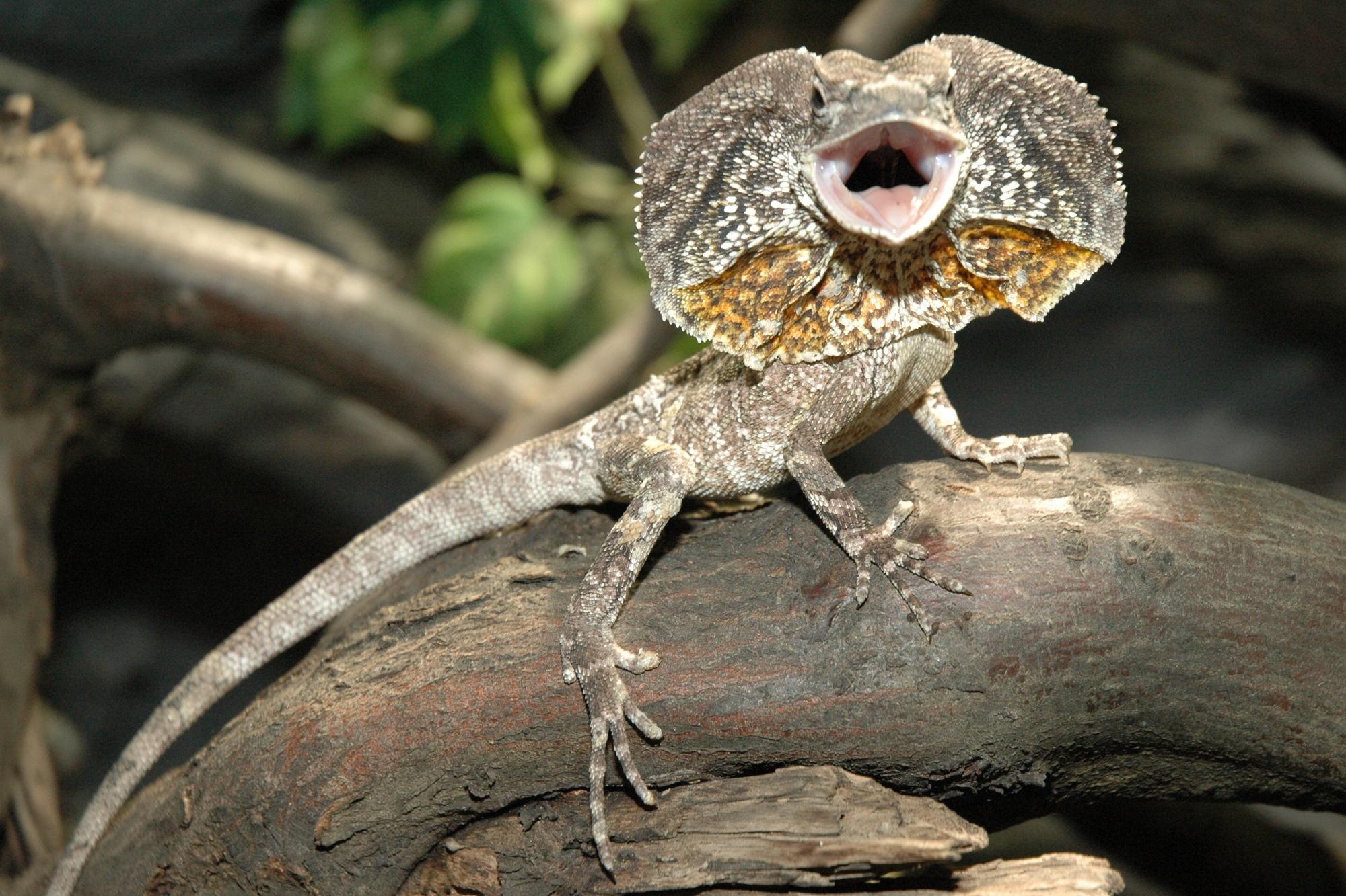 Při vyrušení roztahuje velký kožovitý límec, je to strategie, která má za účel odradit případného útočníka tím, že se z drobného ještěra opticky náhle stane mnohem větší zvíře. Pokud tato taktika nepomůže, dokáže se vztyčit a vydat se na rychlý útěk jen po zadních nohách.Límec používají samci i při imponování a vzájemných soubojích. Dožívá se 8 - 10 let.