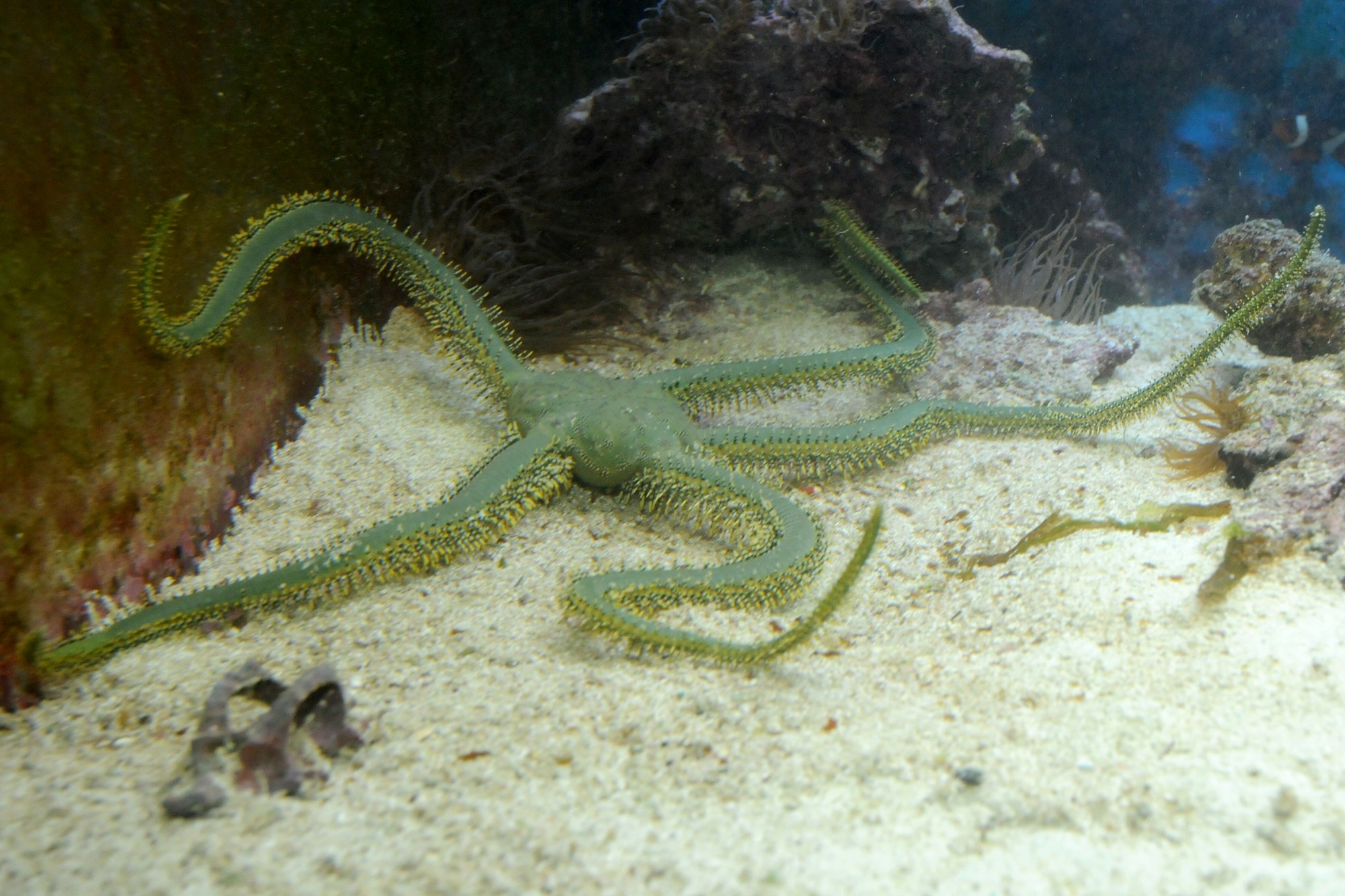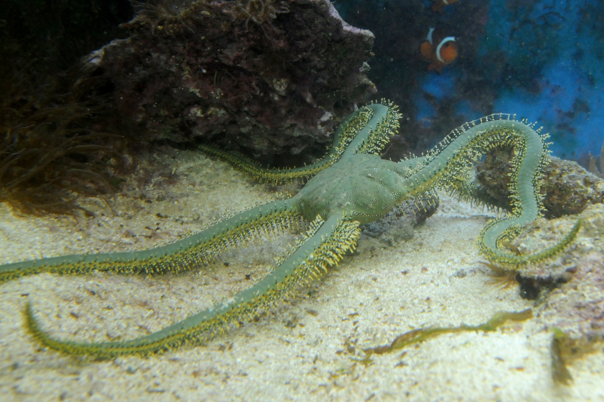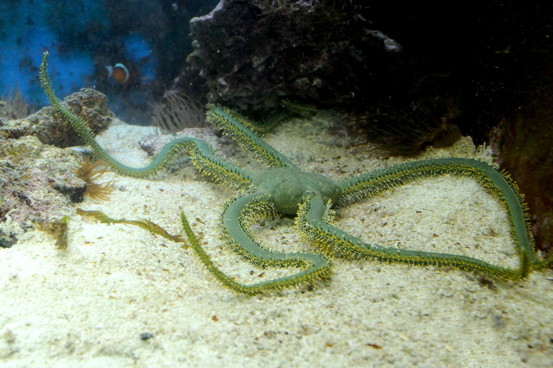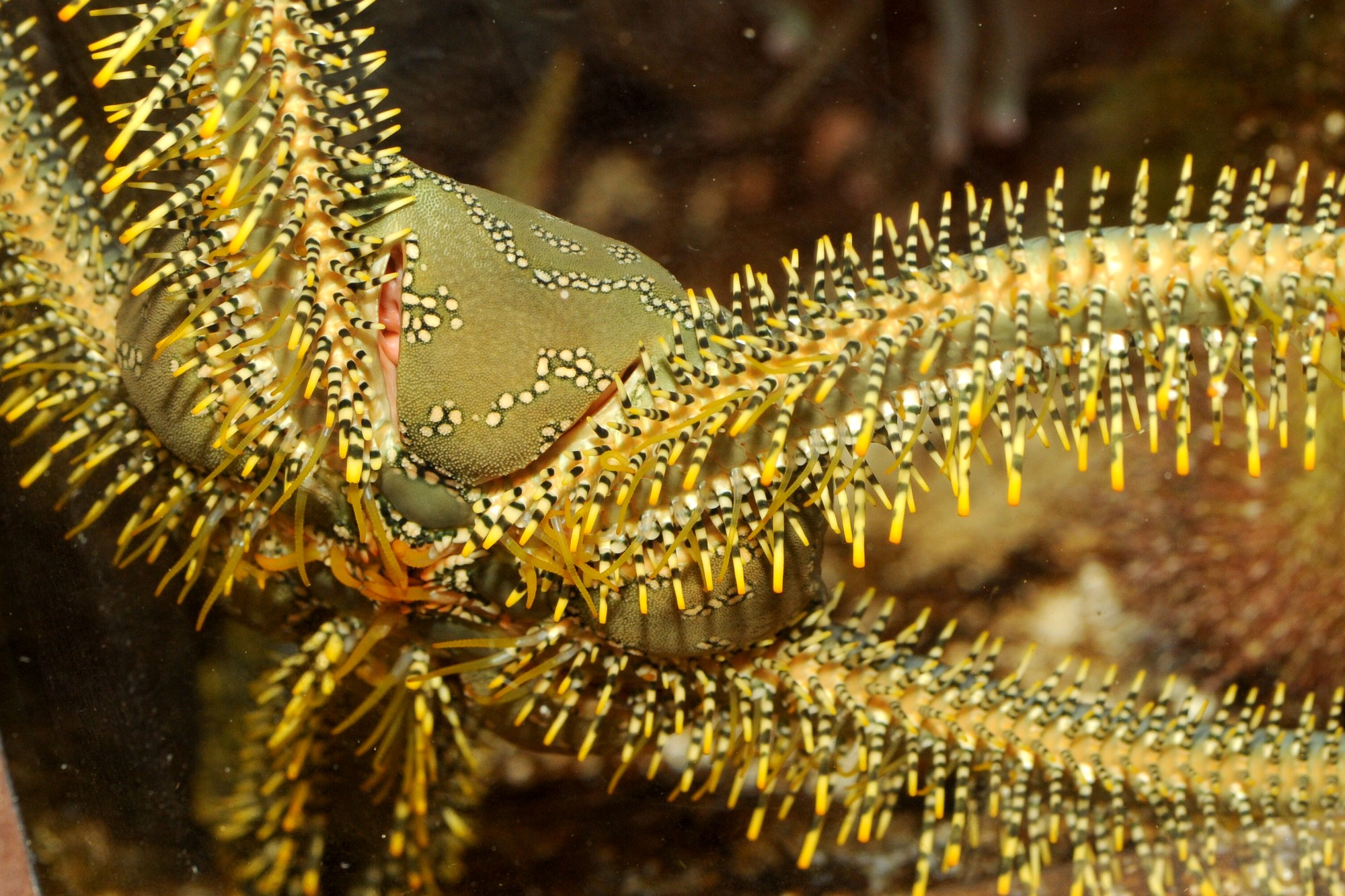 Žije na písečném dně a korálových útesech v hloubce 5 - 40 metrů. Tělo má asi 5 cm v průměru, chapadla jsou dlouhá až 25 cm. Aktivní je v noci, ve dne se ukrývá pod kameny. Živí se bezobratlými živočichy a uhynulými rybami.