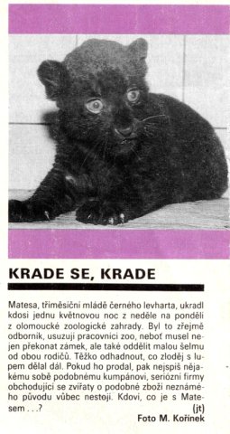 I levharti se kradou!!! Krádeže želv, papoušků a jiných exotických ptáků ale i poštolek a káňat byly v osmdesátých letech a na počátku devadesátých poměrně běžné. 27. května 1991 vyrazil neznámý pachatel okno na pavilonu šelem, oddělil levhartici a odnesl tříměsíční mládě černého levharta. Bylo jasné, že provoz na pavilonu šelem musel velmi dobře znát. Policie případ po několika týdnech odložila. Po článcích o jeho odcizení v tisku se přihlásilo několik svědků, kteří kotě viděli a 5. srpna vrátil nový majitel mládě zpět do zoo. Podle jeho výpovědi jej koupil na trhu v Praze za 6 000 Kčs i se zfalšovanými doklady.