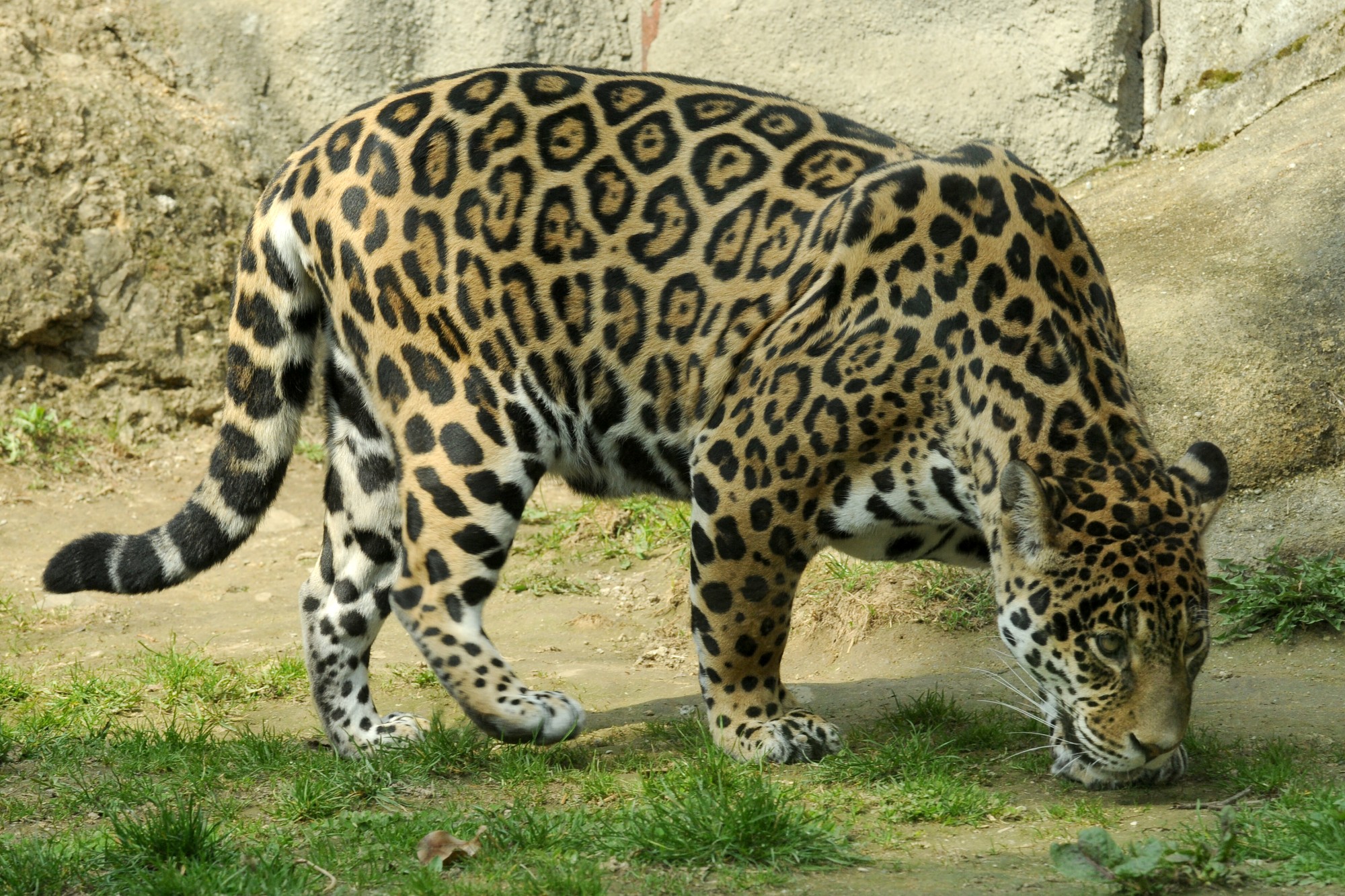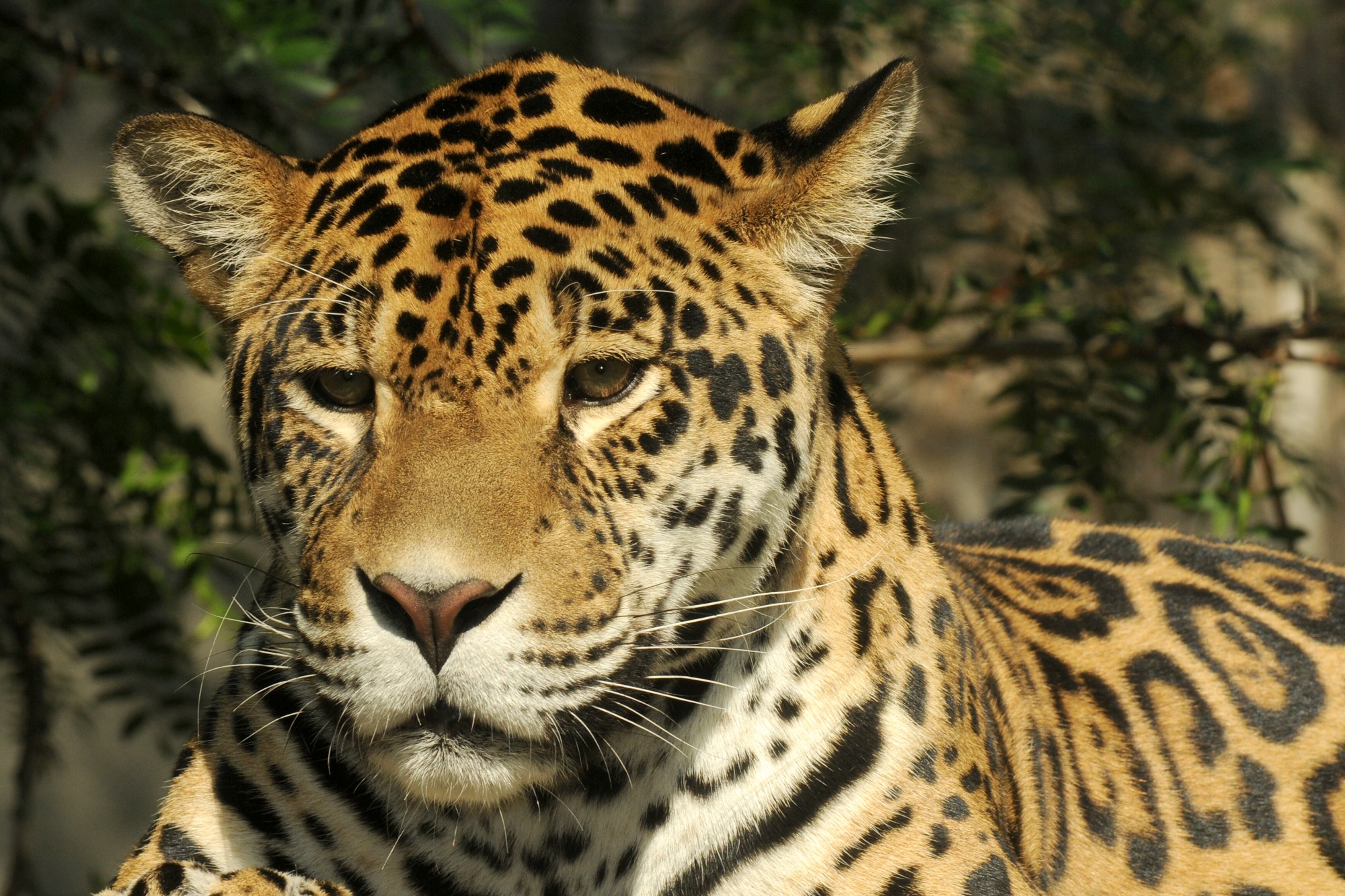 Jaguár má robustnější postavu než levhart a relativně kratší ocas a nohy. Ve větších černých skvrnách nazývaných rozety mají ještě jednu nebo i více černých teček, ty u levhartů chybí. Občas se u něj vyskytují i černě zbarvení jedinci. Ve střední Americe, Mexiku a USA je již vzácný, ale v mnoha nepřístupných oblastech Jižní Ameriky jsou však jeho stavy ještě na přijatelné úrovni. V zajetí se dožívá až 20 let, v přírodě však většinou pouze okolo 15 roků.