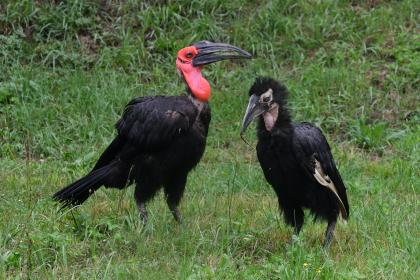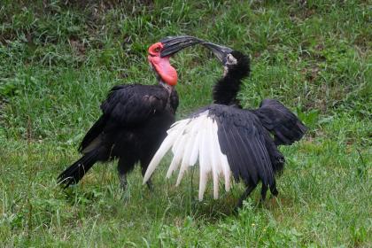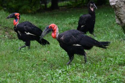 Po úhynu starého samce geparda počátkem srpna zel jejich výběh v centrální části zoo zničehonic prázdnotou. Ne však na dlouho. V tomto týdnu jej obydlela čtveřice prazvláštních ptáků z afrických savan, zoborožců kaferských (Bucorvus leadbeateri). Pamatujete na dvě mláďata odchovávaná za pomoci „maňáska“ minulý rok? Tak přesně ta můžete nyní spolu s jejich přirozenými rodiči pozorovat na velkorysém travnatém výběhu, skoro jako v jejich domovině. Sbírají tam slimáky, ze země vytahují žížaly a mají možnost naplno projevit jejich typické přirozené chování, kdy ve skupinách prozkoumávají africké pláně a hledají něco k snědku.
