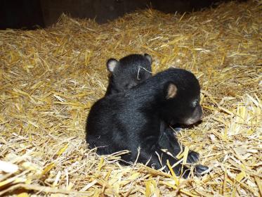 Medvíďatům se daří dobře, jsou dvě, sameček a samička. Momentálně váží přes dvě kila, což je krásný přírůstek. Nevíme sice jaká byla konkrétně jejich porodní hmotnost, ale obvykle mívají mláďata tohoto druhu při narození 200 – 400g. Je tedy patrné, že krásně prospívají. Jsou samozřejmě v kotci s matkou, která pospává, jak je u baribalů v tomto období a při přetrvávajícím velmi chladném počasí zvykem. Tento stav bude trvat ještě několik měsíců. Jejich rušení by mohlo mít nepříznivé dopady, proto je i přítomnost ošetřovatelky stále omezena na minimum. Máme k dispozici první dvě fotografie pořízené ošetřovatelkou při nezbytné kontrole a prvním vážení.