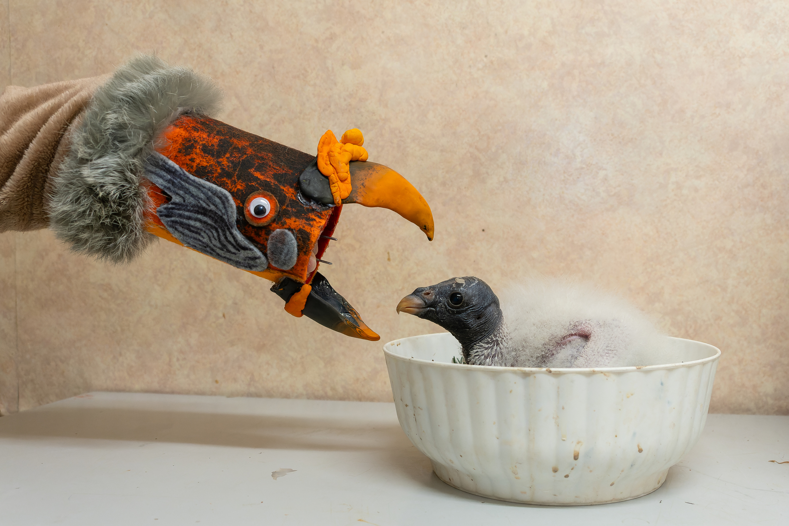 Při podávání potravy se používala maketa hlavy dospělého kondora královského, tzv. „maňásek“. Barvami věrně kopíruje barvy hlavy rodičů. Chovatel samotný je přitom schován za zástěnou. Cílem je, aby mládě bylo co nejméně fixováno na člověka. Odchov probíhá v zázemí, kde udržujeme maximální klid a malý kondor tráví čas v kleci, z níž má výhled pouze do vnitřní ubikace jeho rodičů.