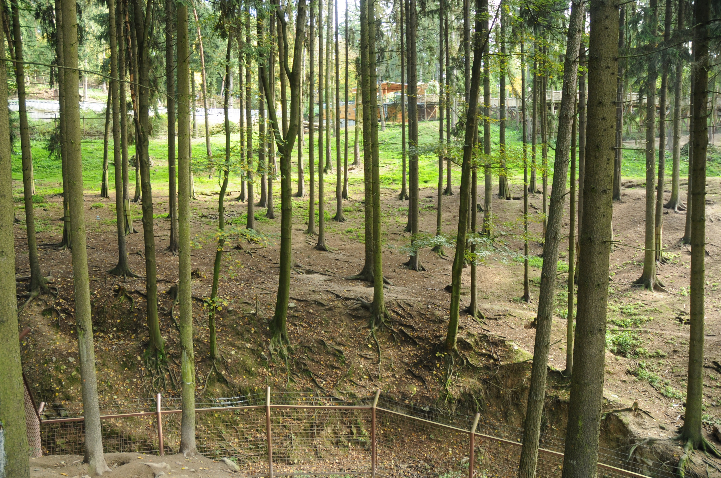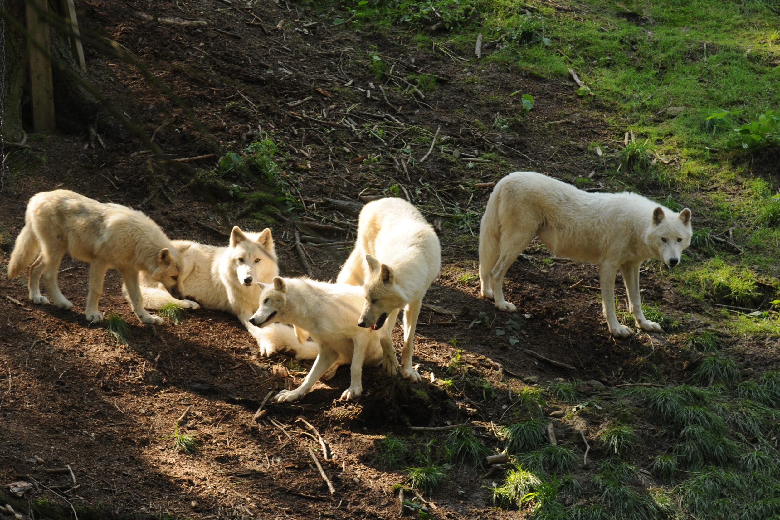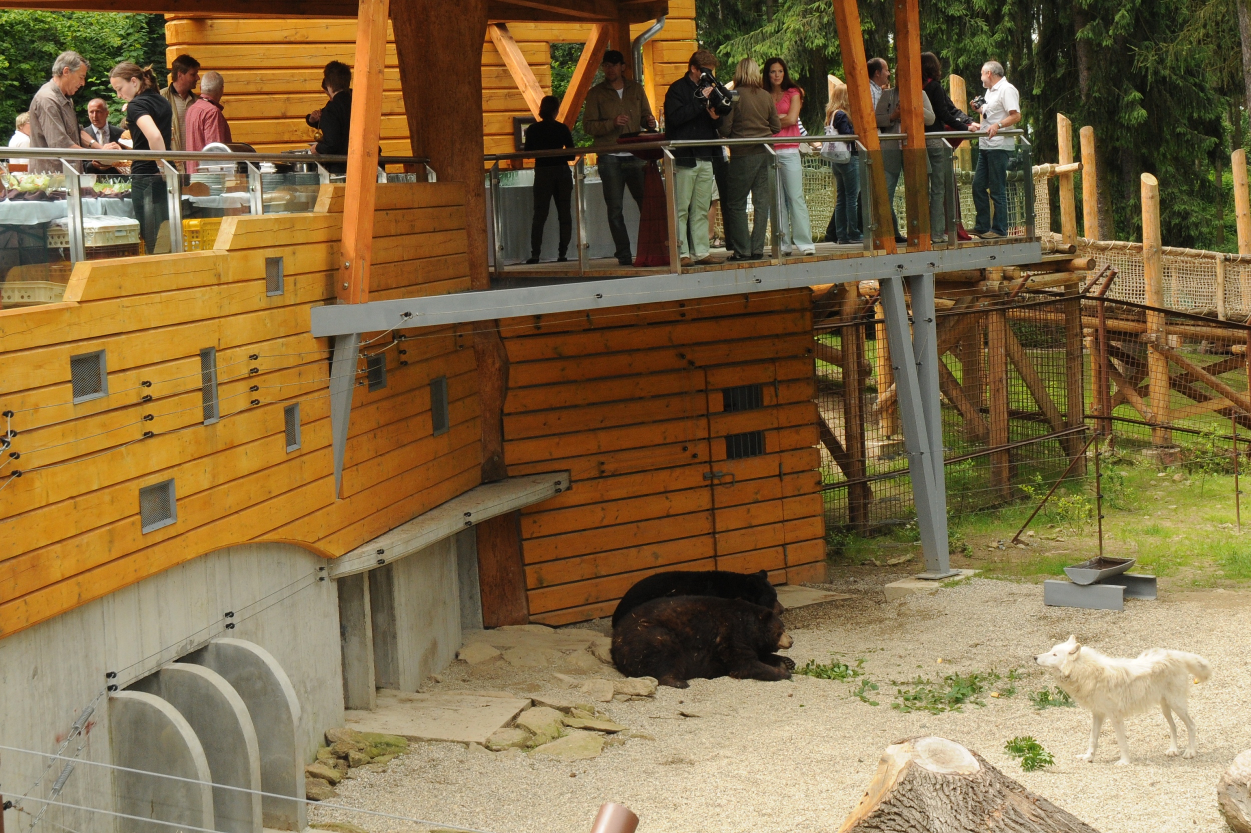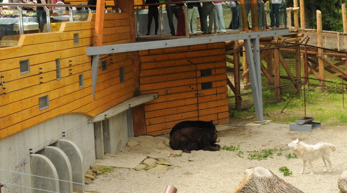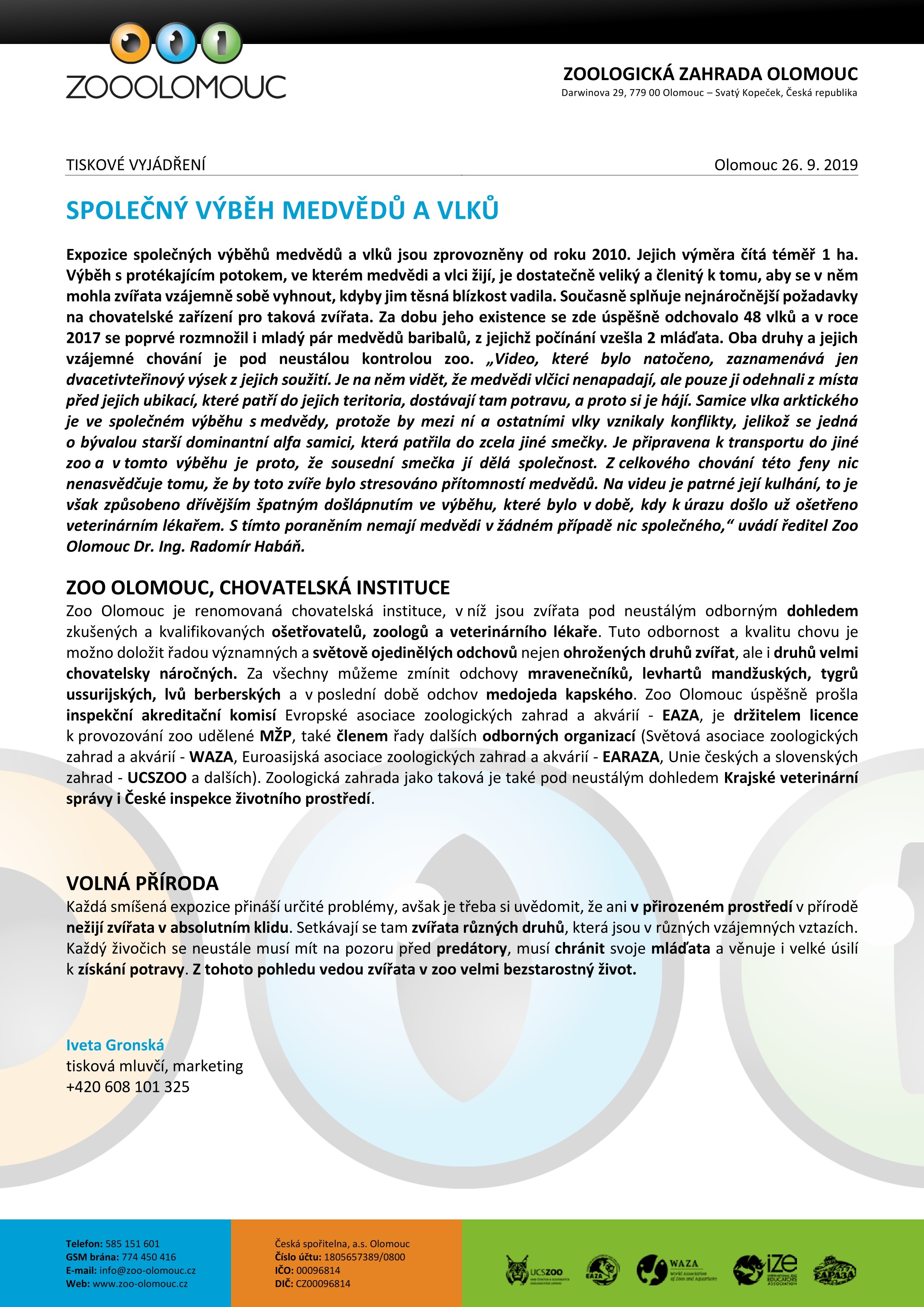 Expozice společných výběhů medvědů a vlků jsou zprovozněny od roku 2010. Jejich výměra čítá téměř 1 ha. Výběh s protékajícím potokem, ve kterém medvědi a vlci žijí, je dostatečně veliký a členitý k tomu, aby se v něm mohla zvířata vzájemně sobě vyhnout, kdyby jim těsná blízkost vadila. Současně splňuje nejnáročnější požadavky na chovatelské zařízení pro taková zvířata. Za dobu jeho existence se zde úspěšně odchovalo 48 vlků a v roce 2017 se poprvé rozmnožil i mladý pár medvědů baribalů, z jejichž počínání vzešla 2 mláďata. Oba druhy a jejich vzájemné chování je pod neustálou kontrolou zoo. „Video, které bylo natočeno, zaznamenává jen dvacetivteřinový výsek z jejich soužití. Je na něm vidět, že medvědi vlčici nenapadají, ale pouze ji odehnali z místa před jejich ubikací, které patří do jejich teritoria, dostávají tam potravu, a proto si je hájí. Samice vlka arktického je ve společném výběhu s medvědy, protože by mezi ní a ostatními vlky vznikaly konflikty, jelikož se jedná o bývalou starší dominantní alfa samici, která patřila do zcela jiné smečky. Je připravena k transportu do jiné zoo a v tomto výběhu je proto, že sousední smečka jí dělá společnost. Z celkového chování této feny nic nenasvědčuje tomu, že by toto zvíře bylo stresováno přítomností medvědů. Na videu je patrné její kulhání, to je však způsobeno dřívějším špatným došlápnutím ve výběhu, které bylo v době, kdy k úrazu došlo už ošetřeno veterinárním lékařem. S tímto poraněním nemají medvědi v žádném případě nic společného,“ uvádí ředitel Zoo Olomouc Dr. Ing. Radomír Habáň.