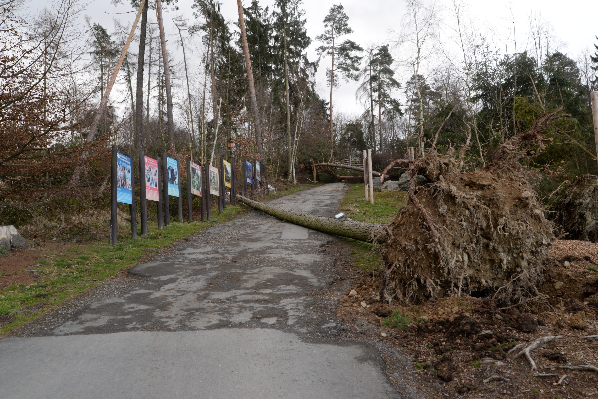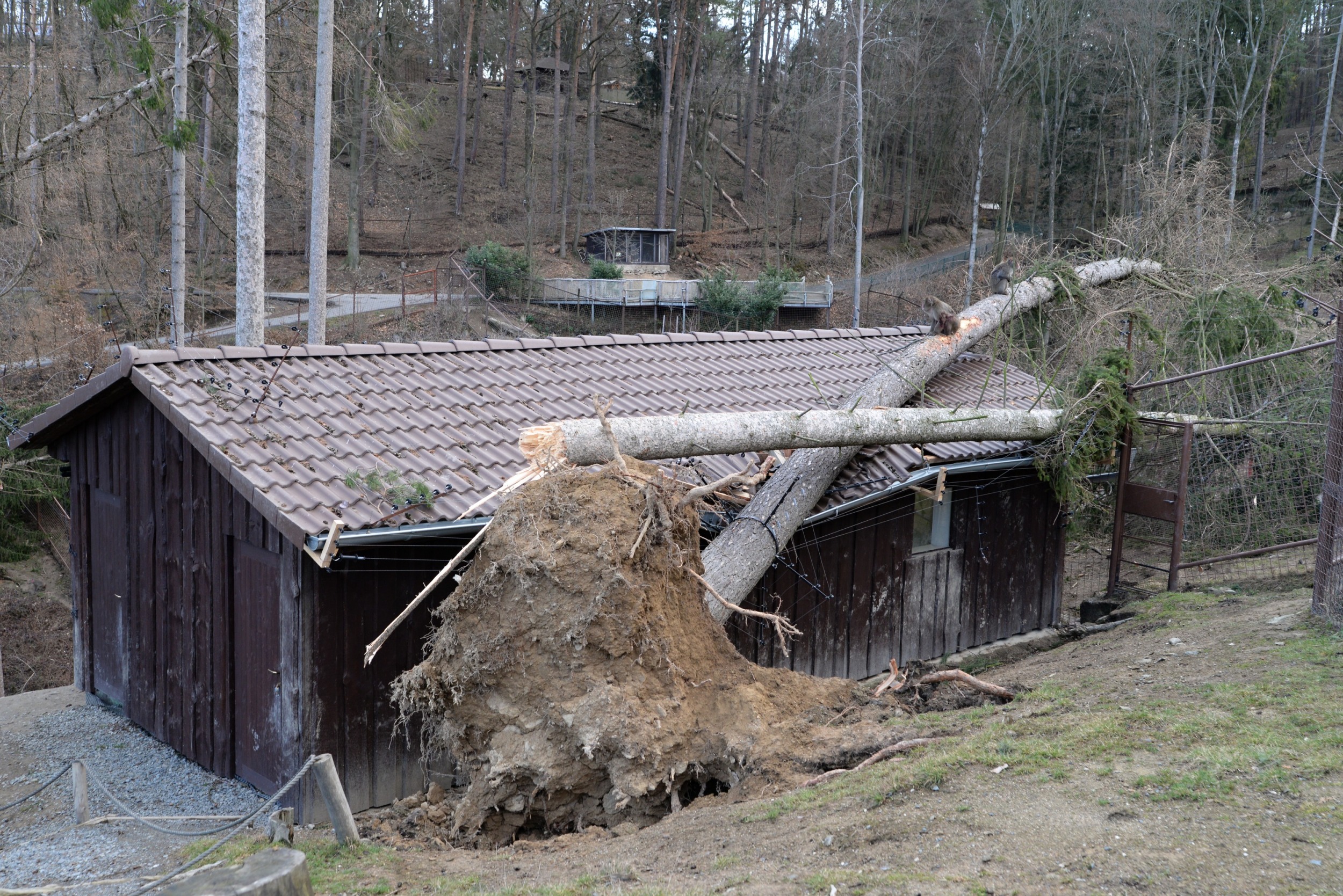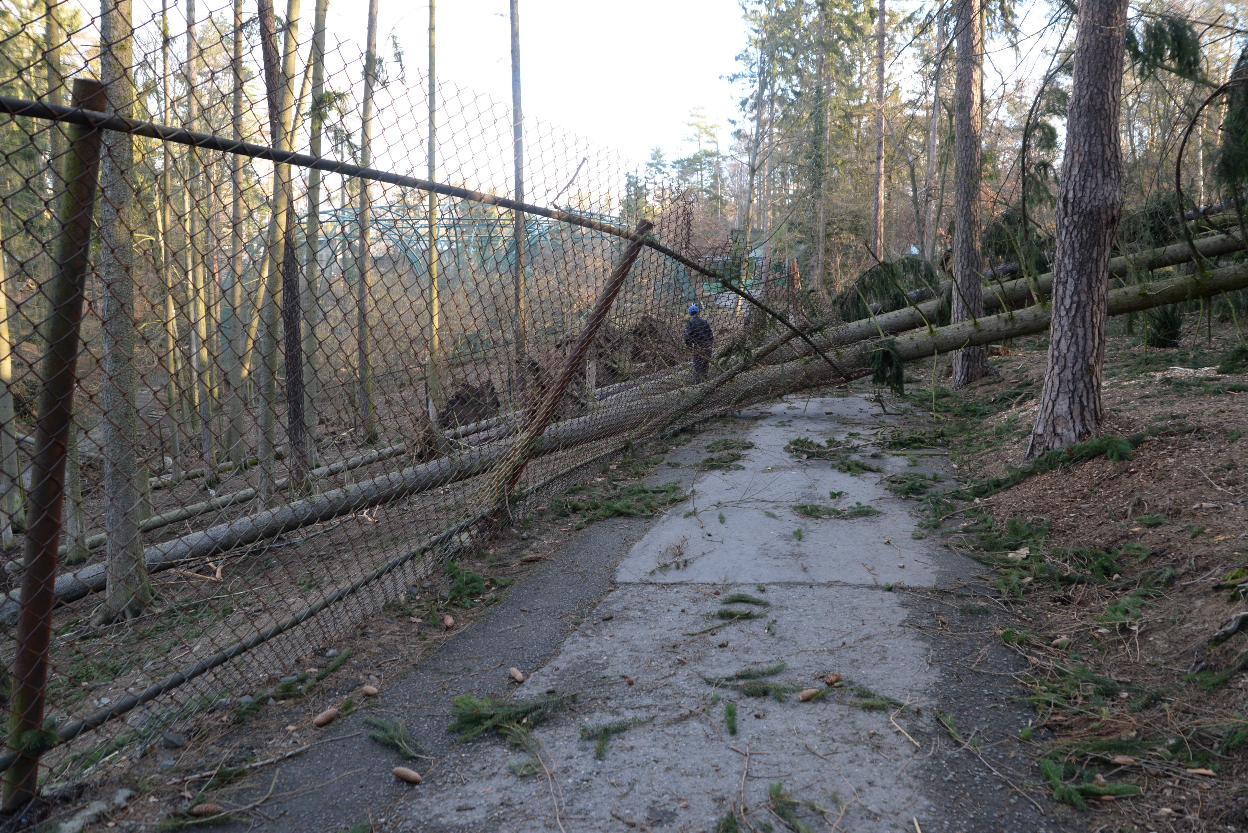 Po posledních dvou téměř jarních týdnech, kdy jsme se intenzivně snažili zahradu po zimě vyčistit a připravit na blížící se Velikonoce, naše plány zhatila noční vichřice. Areál zasáhla s větší silou než předloňská říjnová. Zahrada je stále ještě na několika místech neprůchodná, protože stromy leží přes cesty všemi směry. Poškozeny jsou i ploty několika výběhů a střechy na pár ubikacích. Všechna nebezpečná zvířata byla řádně zabezpečena a nedošlo k jejich úniku z ubikací. Výběhy opustilo jen menší stádo jelenů sika a daňci evropští, celkem v počtu 8 kusů. Zoo jsme dnes uzavřeli a o dalším vývoji budeme informovat.