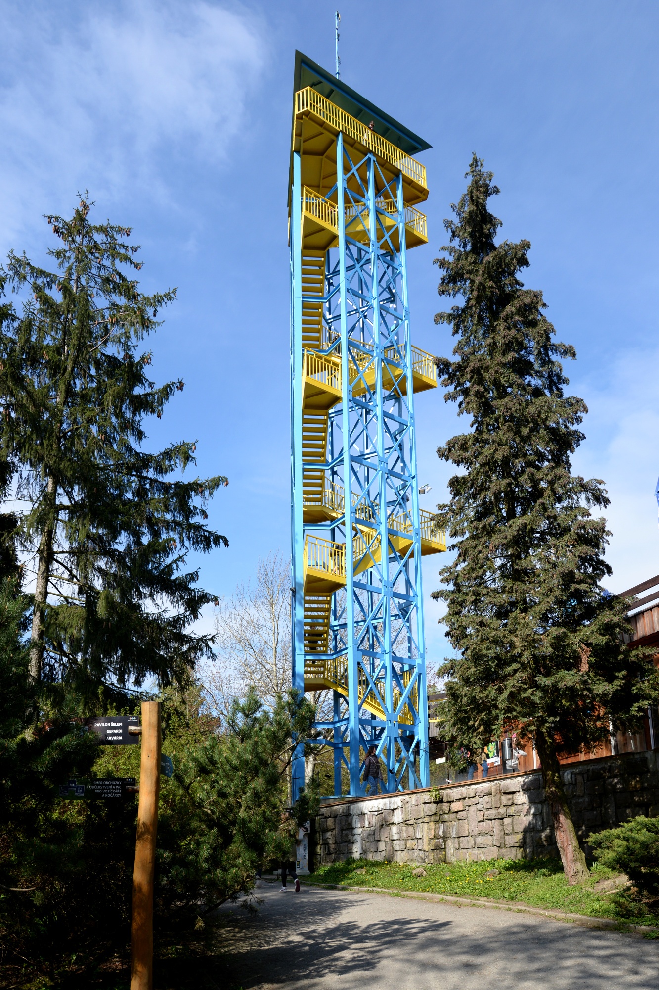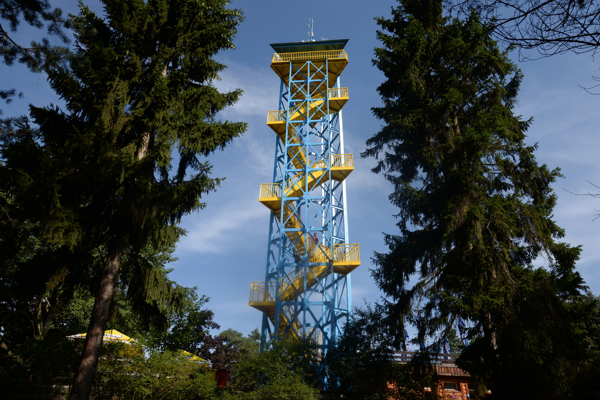Raritou olomoucké zoo je vyhlídková věž s moderní kovovou konstrukcí trojúhelníkového půdorysu. Autorem projektu je architekt Jan Navrátil. Stavba rozhledny byla zahájena v roce 1972 z důvodu mimořádné dotaci komise pro rozvoj cestovního ruchu. O dva roky později, tedy v roce 1974, se z ní pohledem do údolí těšili první návštěvníci. Vyhlídková věž dodnes tvoří hlavní dominantu zoo viditelnou z dalekého okolí. Její celková výška je 32 metrů nad úrovní okolního terénu. Z horní vyhlídkové plošiny, která je ve výšce 29,3 metru, můžeme pozorovat některá zvířata v zoo, obdivovat barokní architekturu baziliky Navštívení panny Marie, sledovat panoráma Olomouce a jeho okolí, nebo za jasného počasí dokonce zahlédnout i siluetu Jeseníků s nejvyšší horou Pradědem. Na věž vás z horní terasy dovede 128 schodů, plocha vyhlídkové plošiny je 18,6 m2. V původním stavu sloužila až do roku 1999, kdy byla započata rekonstrukce obou teras, odstraněno bylo plechové opláštění a věž byla opatřena novým nátěrem. V roce 2015 došlo k další velké rekonstrukci, opravě některých částí zábradlí a výměně podlahy horní plošiny. Věž také získala zářivý modrožlutý antikorozní nátěr. Na dolní terase najdete restauraci Pod Věží s bohatým výběrem občerstvení a venkovním i vnitřním posezením a sociální zařízení.