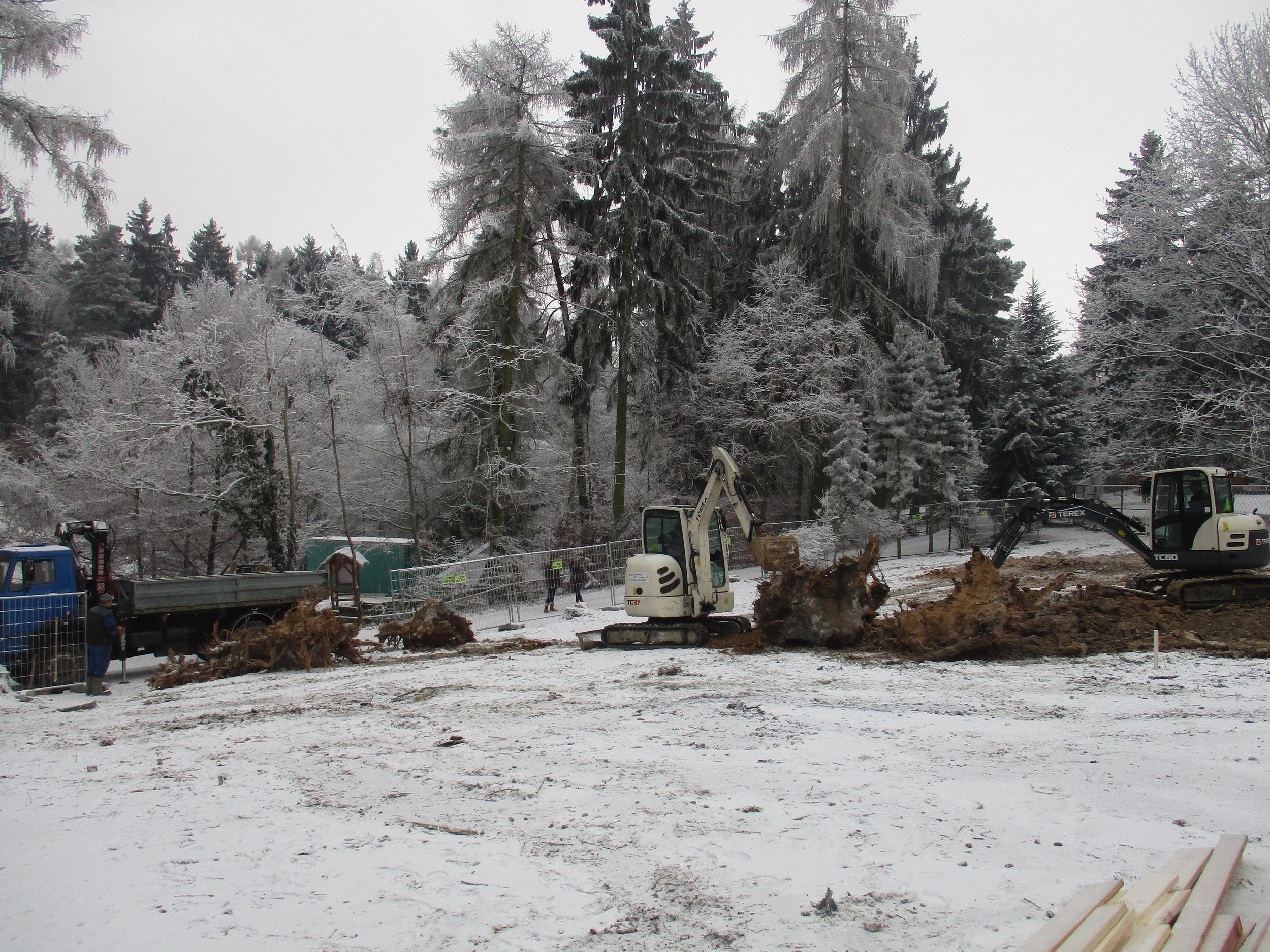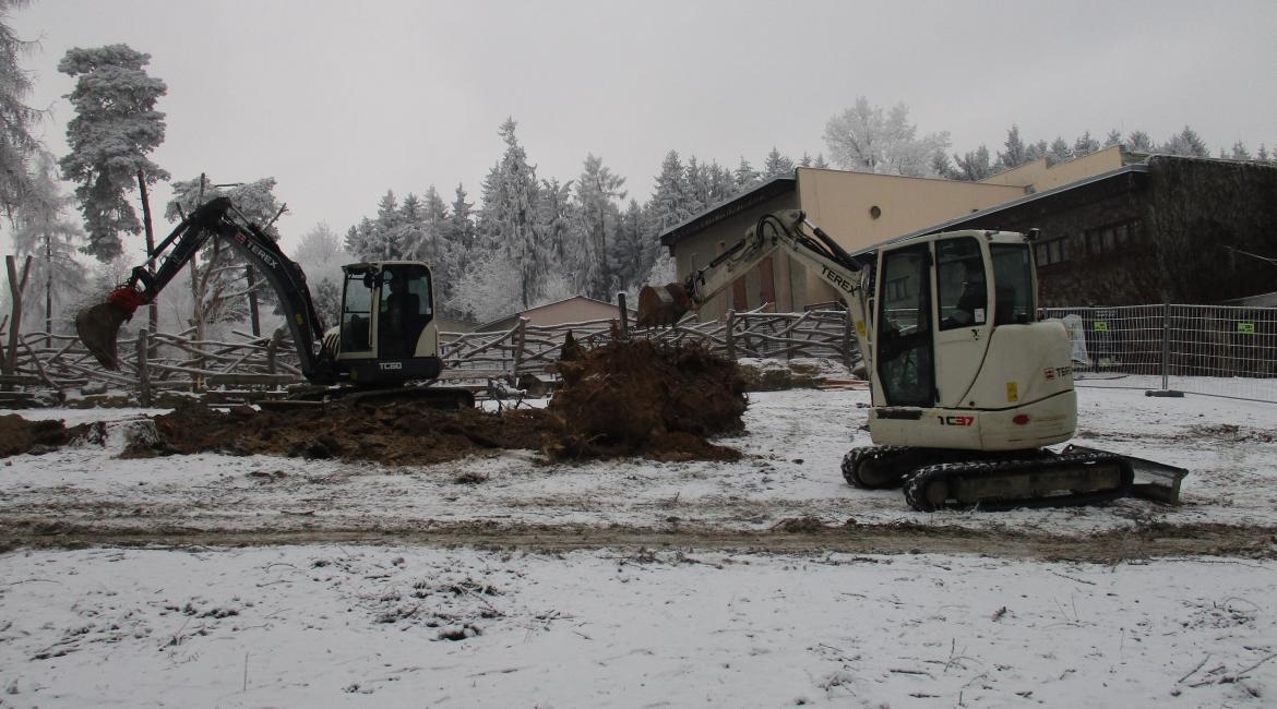 Dnes začala stavební firma JURÁŇ s.r.o. s přípravou pozemku pro nový pavilon KALAHARI. Momentálně odstraňuje pařezy pokácených stromů, čímž pozemek čistí pro kopání základů.