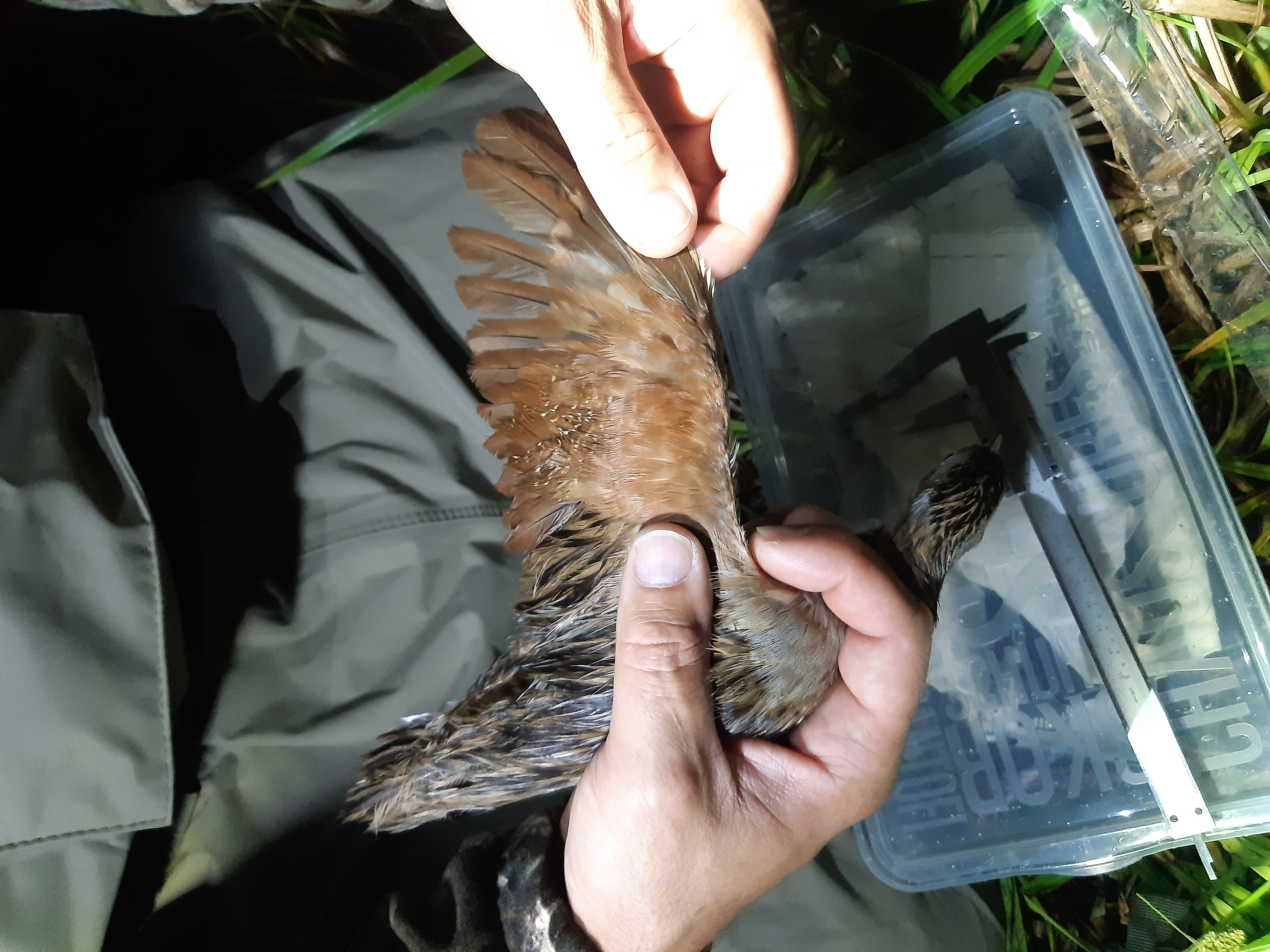 „Šumava, 22:30, ukrutná bouřka, skupina přírodovědců se chystá na výpravu s cílem chytit tajemný přízrak hor. Počasí se naštěstí brzy umoudřuje a my vyrážíme. Zastavujeme na okraji zamokřené horské louky. Chvíli posloucháme. Z louky slyšíme volání dvou rozvášněných samečků. Nazouváme broďáky a razíme si cestu v půlmetrové trávě směrem, odkud se ozývají zvuky. Přicházíme na dvacet metrů od neviditelného tvora. Ušlapáváme trávu pod sebou, krčíme se k zemi, pouštíme hlasovou provokaci a chystáme podběrák k odchytu. Hlas se pomalu ale jistě přibližuje. Už je zatraceně blízko, jeho síla trhá ušní bubínky. Ani nedutáme. Slyšíme, jak si nekompromisně razí cestu vegetací rovnou k nám. A v tom nám zvíře probíhá pod nohama a útočí na reproduktor, z něhož se ozývá hlas konkurenta. Jeden rychlý pohyb podběrákem a luční duch je náš! Není jím nikdo jiný než drobný pták chřástal polní. Následuje vědecká práce. Opeřence kroužkujeme, měříme délku křídla, zobáku, ocasu, nártu, vážíme, a určujeme stáří. Krátká fotodokumentace a vypouštíme samečka zpět na svobodu. Ani na moment ho odchyt neznepokojil. Prakticky okamžitě začíná opět „chřástat“.“